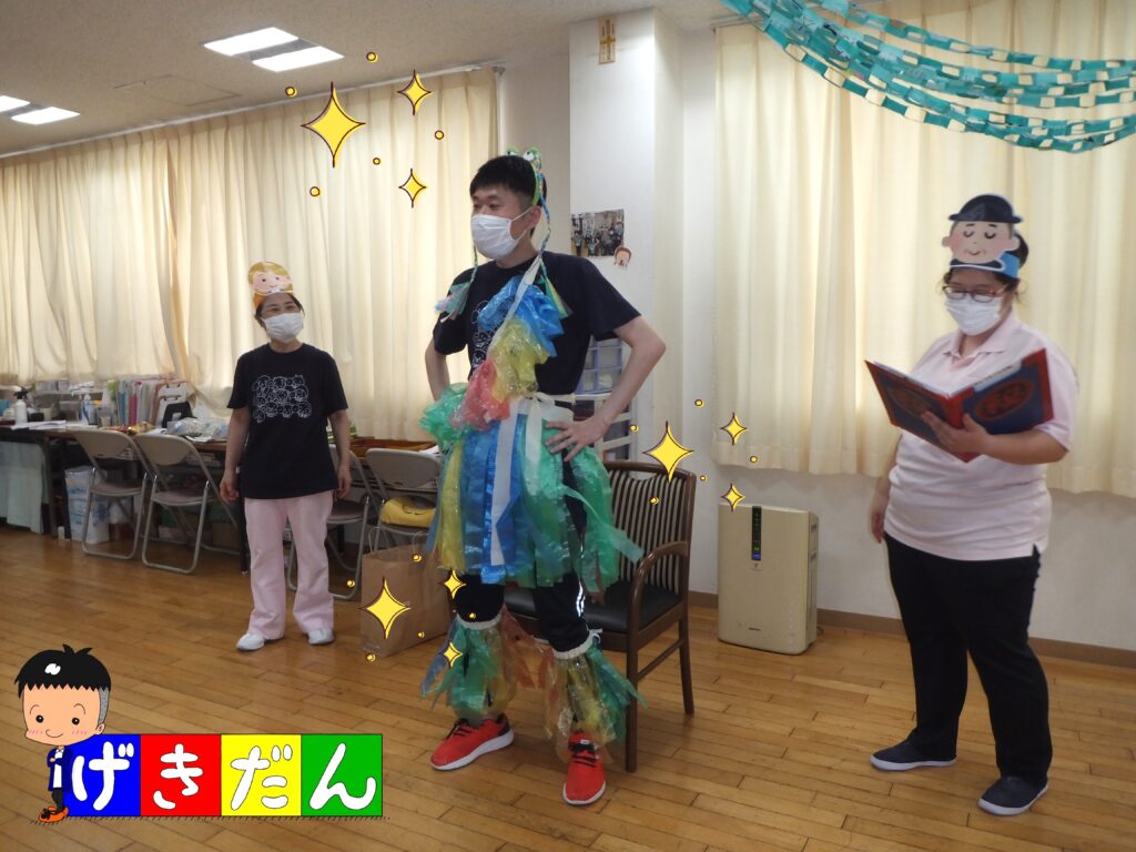 以上がスタッフ『劇団』の『おしゃれ?な王様』でした。この公演は時間にすると約30分くらいのものになっております。劇を公演までに持っていくことは簡単なことではありません。まずは脚本作成から始まり、その後は演者とセリフの読み合わせや、衣装、小物の作成。自主練でセリフを覚え、通常業務の終了後に、演者は集まり、皆で動きとセリフ合わせ。全然苦ではないと言えば嘘になりますが、団員全員楽しんで参加しております。『一つのことを皆で作り上げる』、これはスタッフ間の絆を深めることにもつながります。セリフを覚えることは正直大変ですが、練習で皆で集まっている時間に、雑談や笑い話ができることも、とても貴重で素晴らしい時間と思います。さらにスタッフ『劇団』の公演を見て、利用者さまに少しでも喜んでもらえば、なお本望です。これからもスタッフ『劇団』は、学校のサークル活動のように、楽しくやっていければと思っていますので、皆さまに暖かく見守って頂けると嬉しいです。
