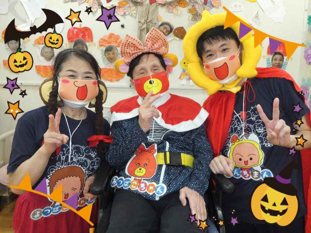 続きましては、ハロウィンに欠かせない【仮装撮影会📷】です。実は利用者さまには【開会式】の際に、クジを引いてもらい、そこに書かれた『よつばオールスターズのキャラクター』に仮装して頂きました。スタッフも仮装しているので、スタッフも一緒に混じり記念撮影をしました。