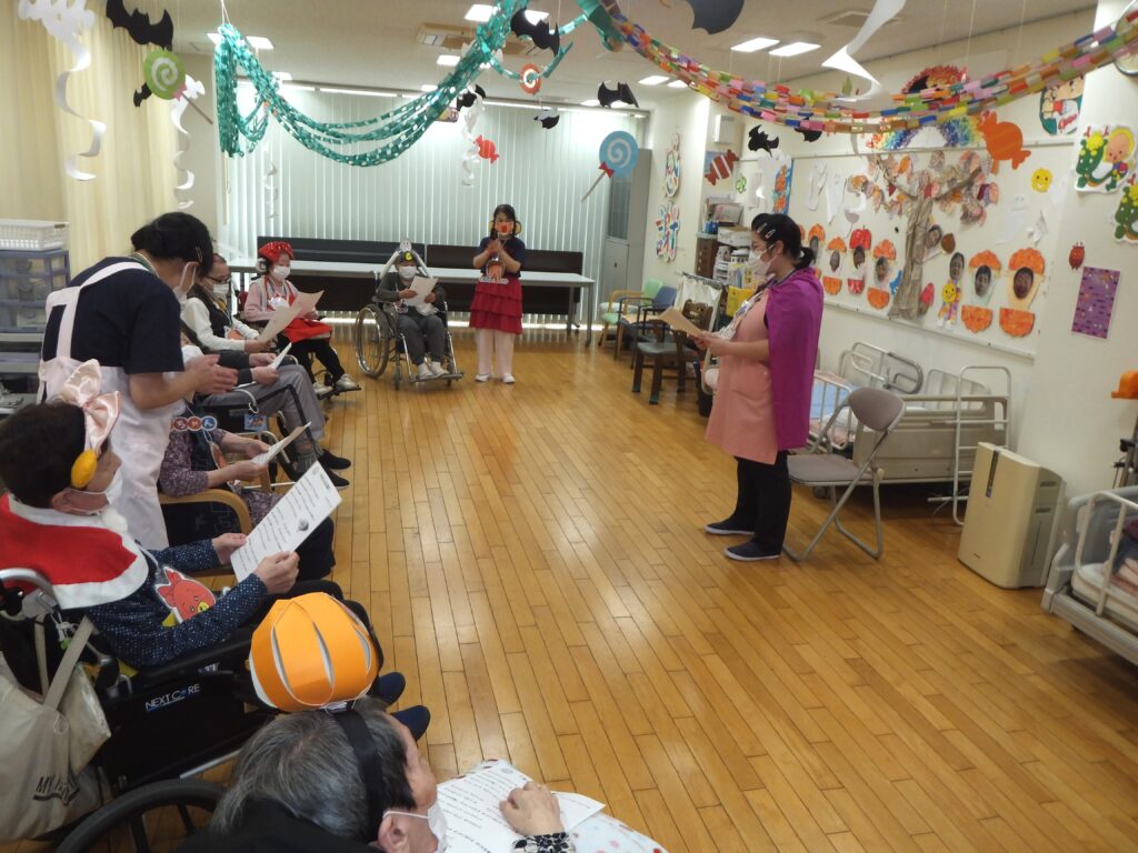 まずは【開会式】です。ここでは皆さまに『ハロウィン』について簡単な説明、会場の飾り付け、そしてプログラムの説明等をさせて頂きました。『ハロウィン』の説明の際には、あまり馴染みがないのか反応がイマイチでしたが、プログラムの説明の際には「楽しみ!」と言った声を戴きました(*^▽^*)