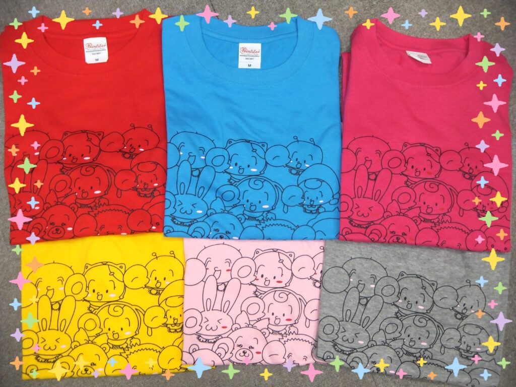 当『よつばケアセンター』のイベントの時に、着用している『よつば(ケアセンター)オールスターズTシャツ』。今まで『白』と『紺』の2色しか ありませんでしたが、この度 他の色も作ってみました。