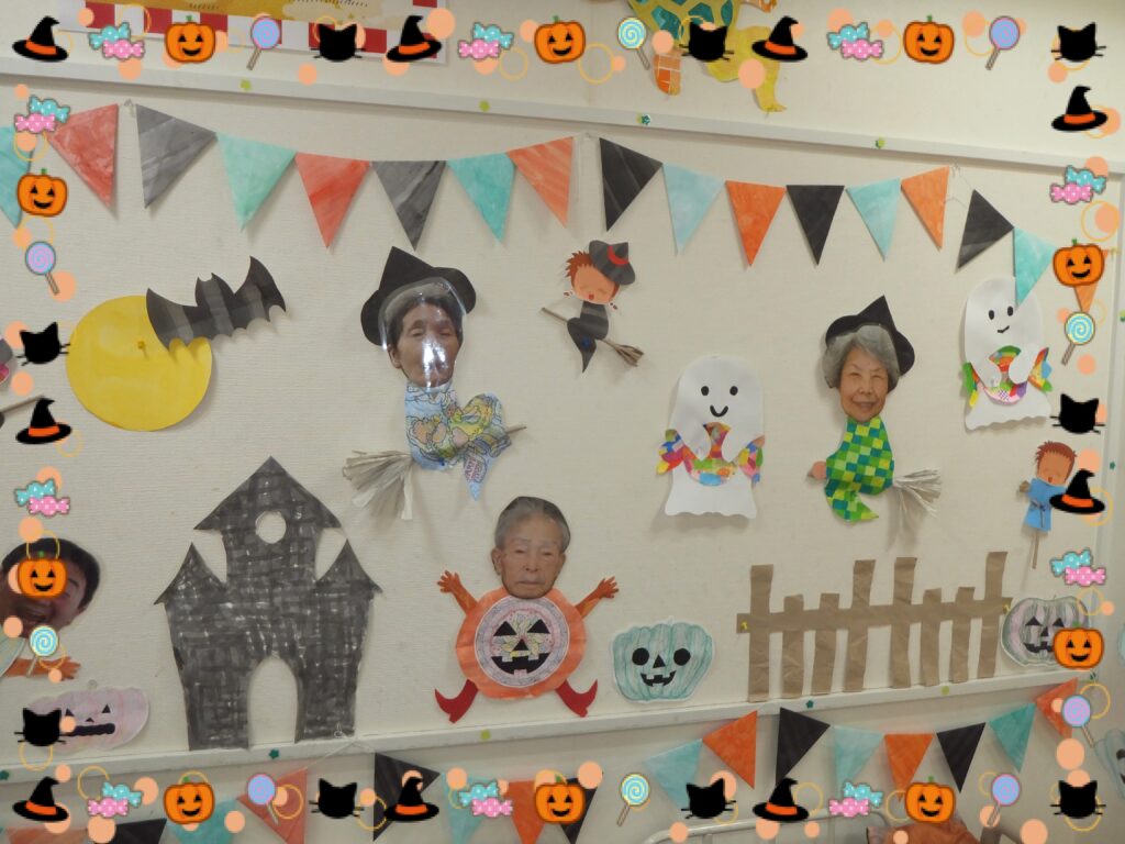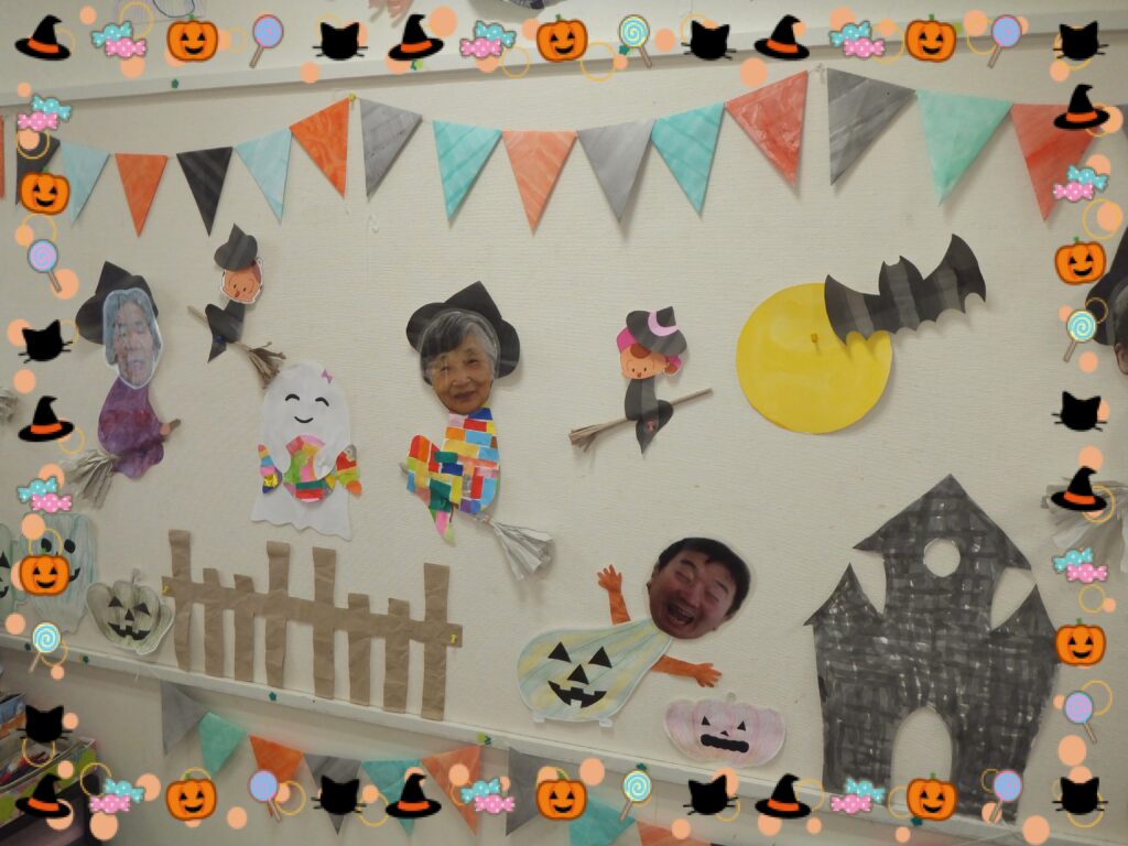 こちらは掲示板です。女性の利用者さまには『魔女』に、男性の利用者さまには『かぼちゃおばけ』になって 頂きました。利用者の皆さまも自分がどこに居て どのような姿になっているのか探されていました(≧▽≦)