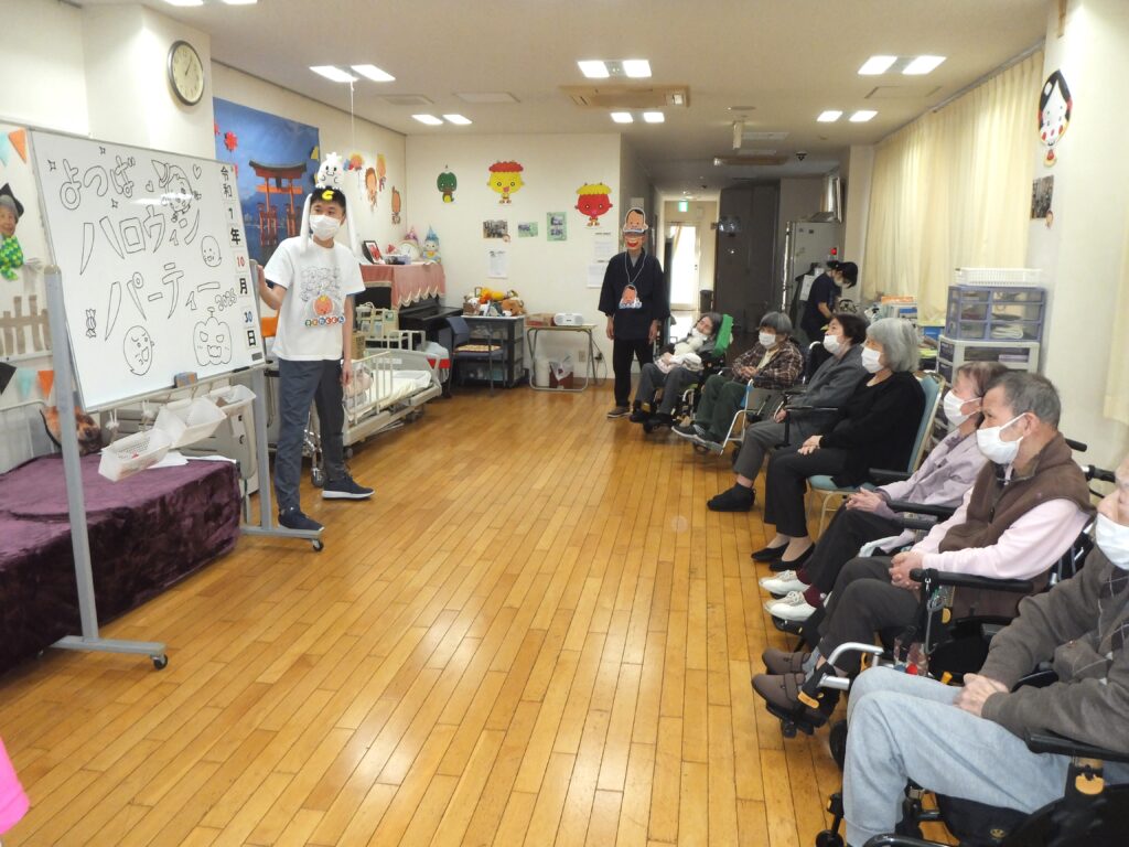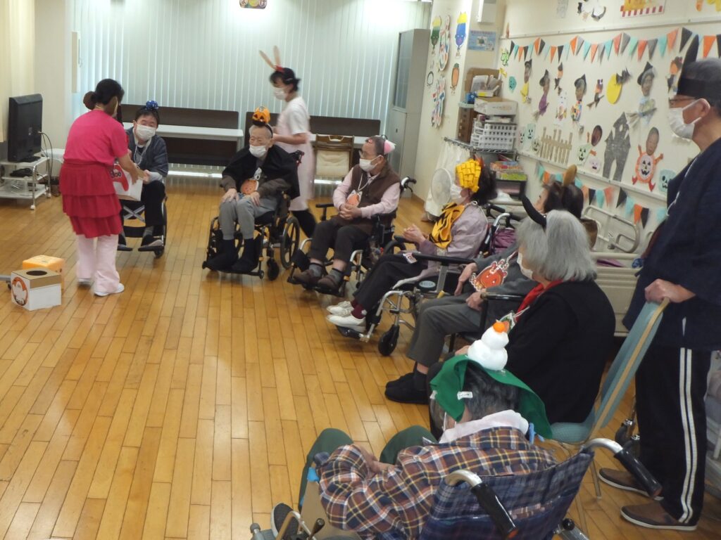 皆さま、『ハロウィン』と言えば何を思い浮かべますか?『お菓子』、『おばけ』、『トリックオアトリート』など色々ありますが、私が1番に思い浮かべるのは、やっぱり『仮装』かな。と いうことでスタッフは『仮装』をしての登場です!仮装の種類は去年と同様、当『よつばケアセンター』のキャラクターに扮しました。それを見た利用者さまからの反応は良好⤴️でした(*´▽`*) 開会式では、会場の飾りつけの紹介や、利用者の皆さまに あまり馴染みがないと思われる『ハロウィン』の説明を簡単にさせて頂きました。皆さま「ふむふむ」と聞かれていました。