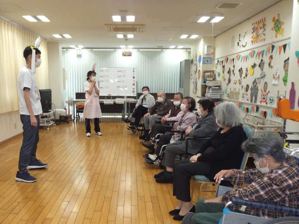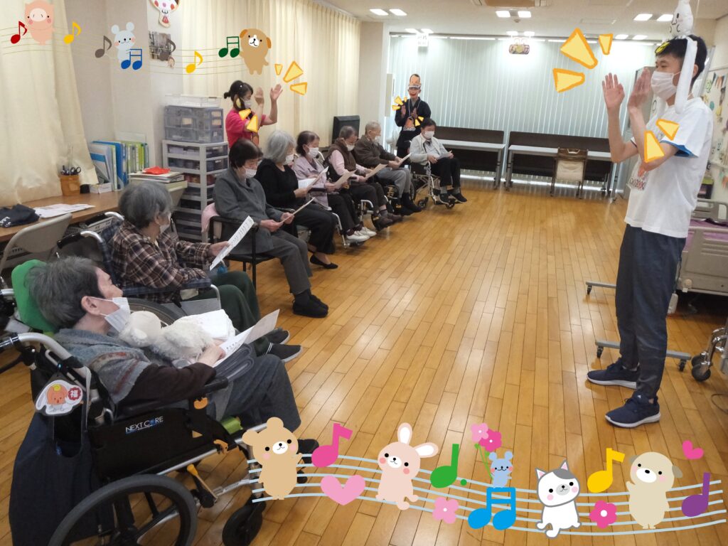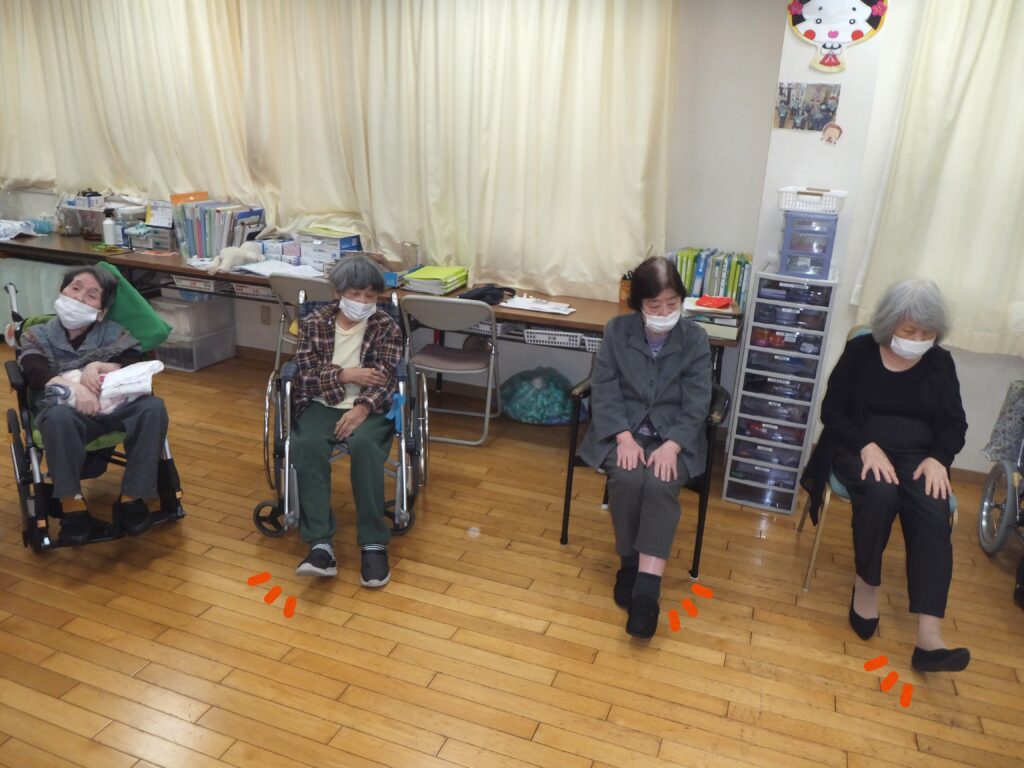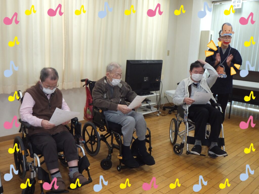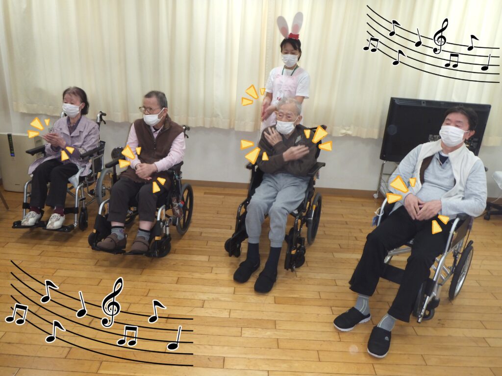 次は音楽に合わせて体を動かしていきます。体操を考案したスタッフは【簡単】で【リズム】に乗りやすい動きを意識して考えました。利用者の皆さまは進行スタッフの動きを見て、元気よく身体を動かして下さいました🎵