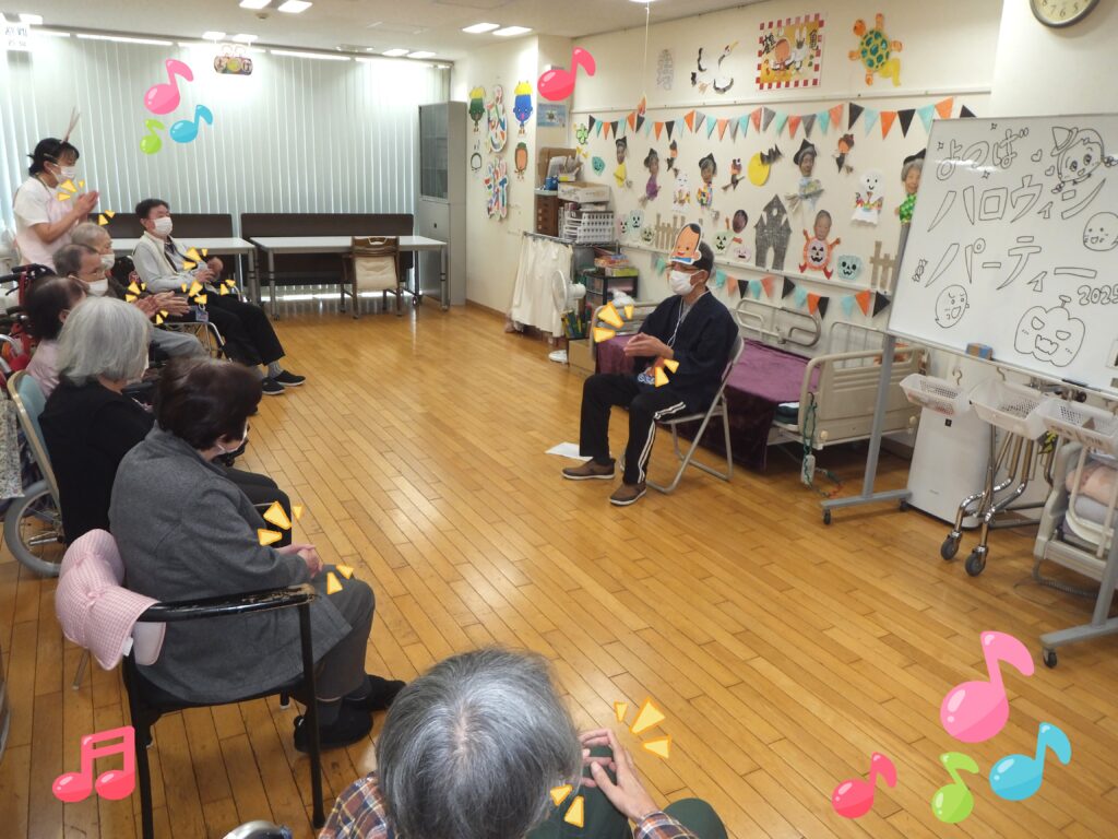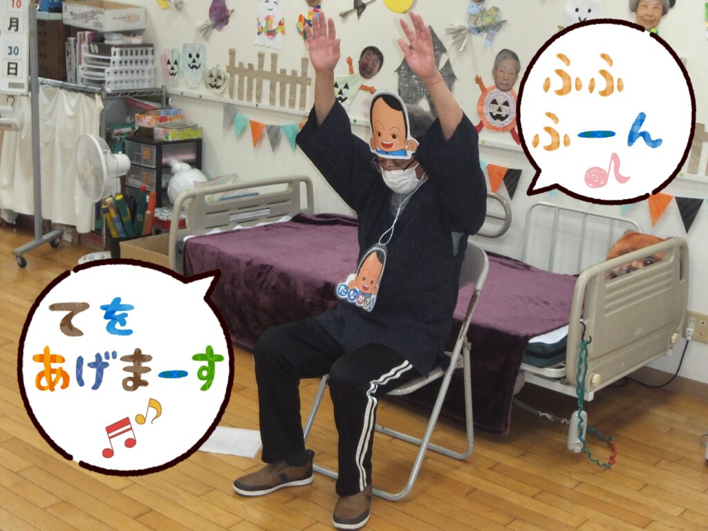 さぁ!ついに『ハロウィンパーティー』の始まりです🎉最初の演目は歌体操です。楽曲は『ハロウィン』を感じるものに したかったのですが、利用者の皆さまに馴染みのある歌が思いつかなかったため、秋の定番ソングでもあり、皆さまも知っている『もみじ🍁』を選ばせて頂きました。まずは みんなで『もみじ』を歌いました。「あ~きのゆうひ~に~🎵」