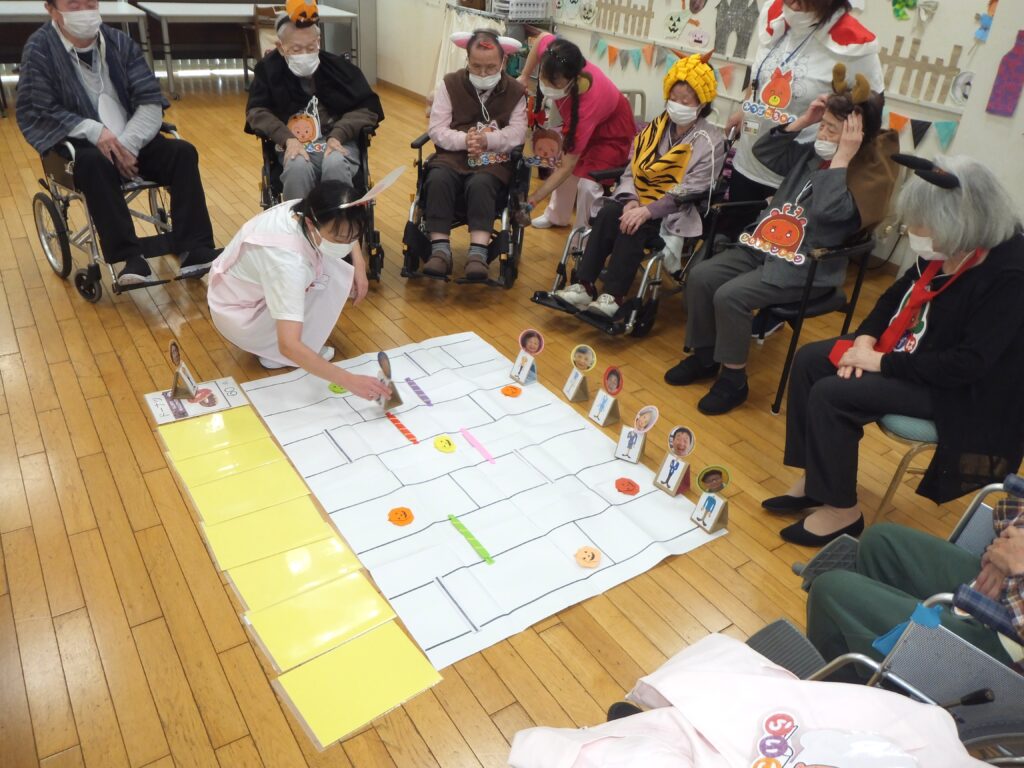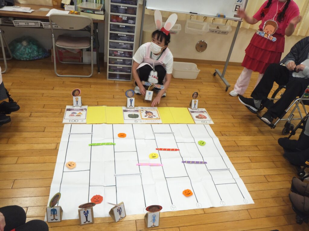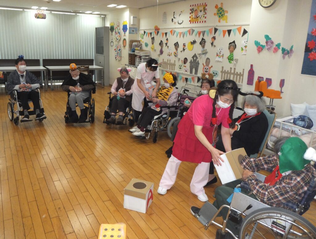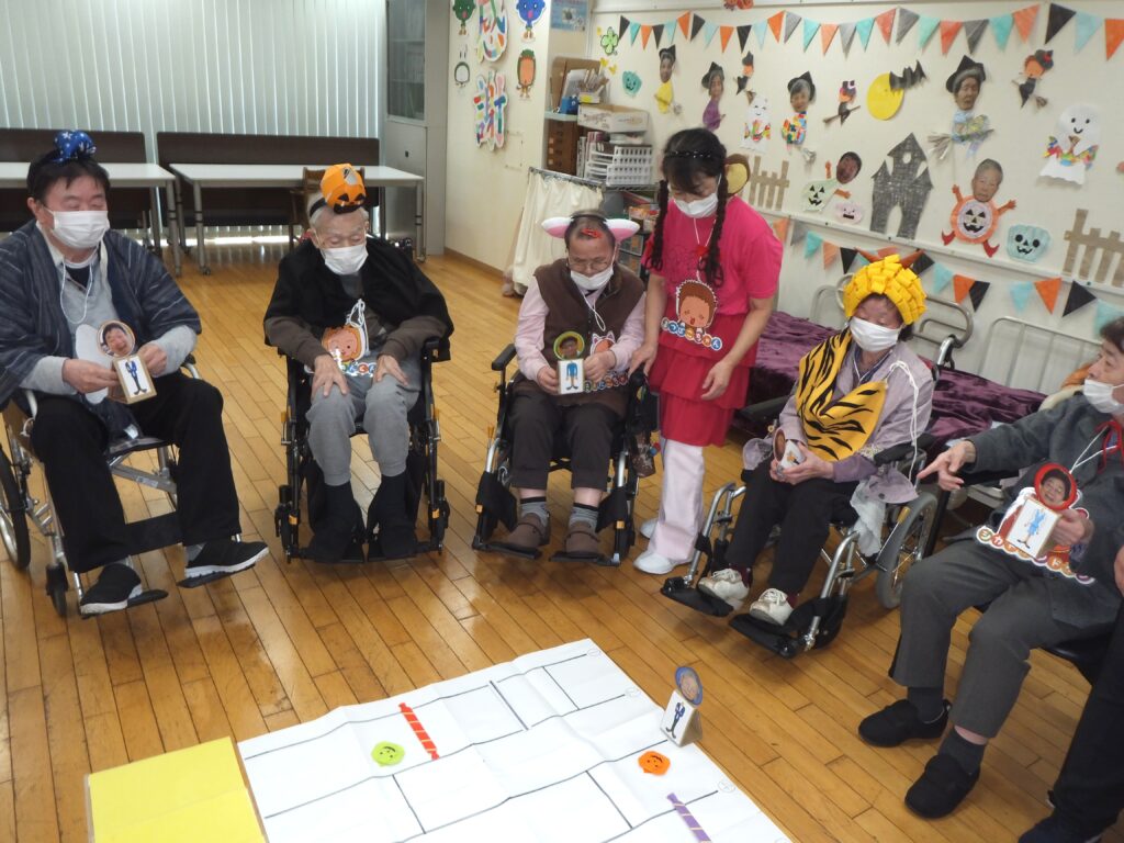 次の演目はレクリエーションの時間です。ゲームの説明をさせて頂きます。『🍬お菓子の箱』と『👻おばけの箱』の2種類があります。利用者の皆さまには まず『お菓子の箱』の中からくじを引いて頂きます。その中には『お菓子カード』と『おばけカード』が入っています。『お菓子カード』を引いたら、そこに書かれている点数を得ることができます。『おばけカード』を引いたら、みんなで『いたずら』合戦の 始まりです。利用者さま全員に『👻おばけの箱』から1つずつカップを引いて頂きます。カップに中には色々な『いたずら』が書かれています。一番ひどい『いたずら』の書かれている くじを引いた方(かた)が勝ちとなり、その方(かた)にサイコロを振って頂き、出目数に10倍を掛けた点数を得ることが できます。これを繰り返していき、最終的に1番得点の高い人が優勝というゲームに なっております。