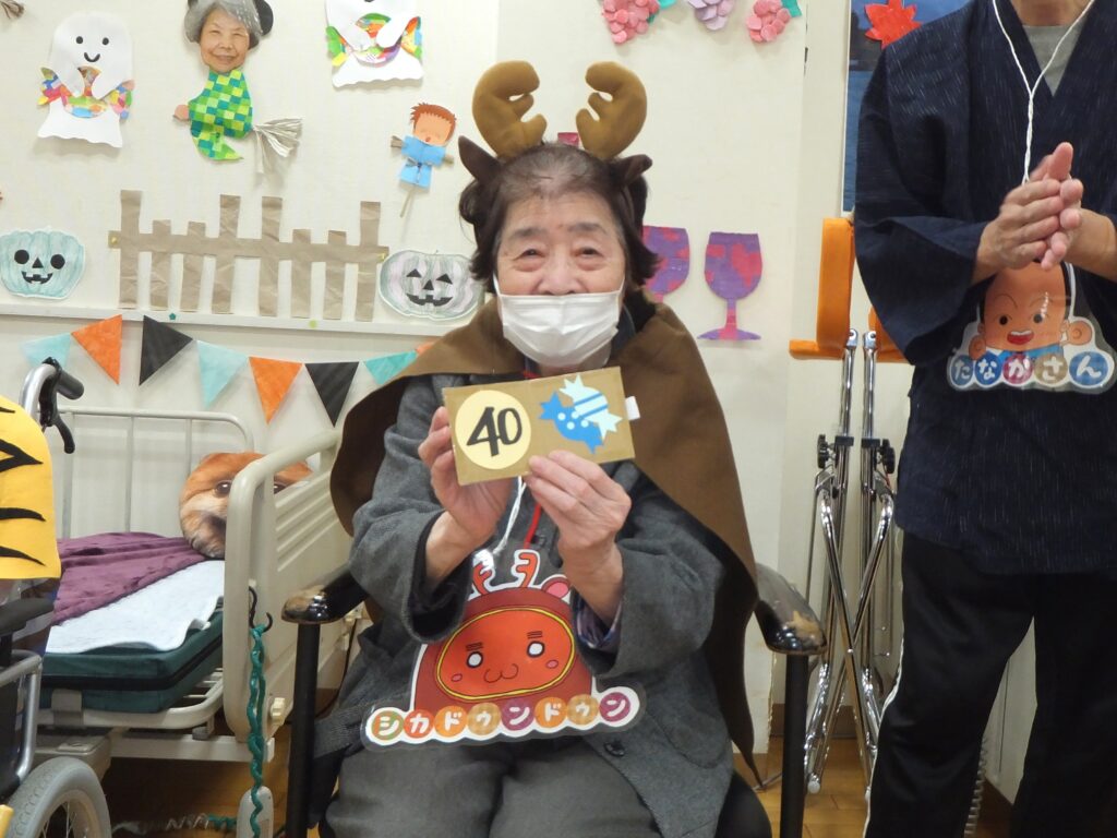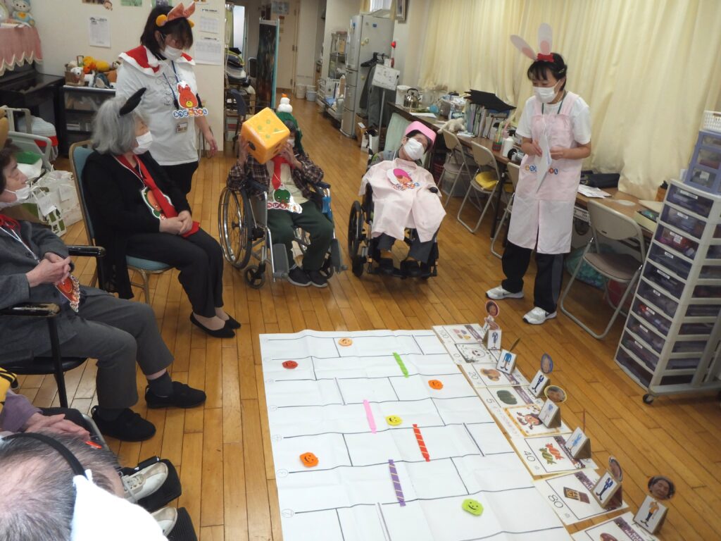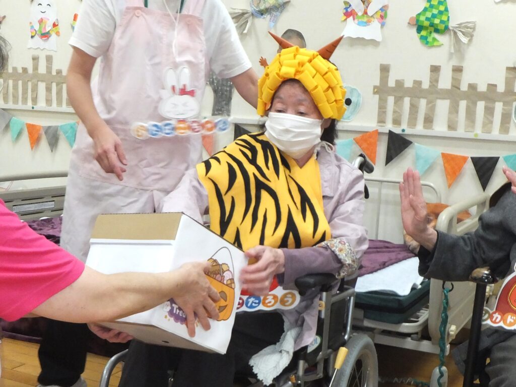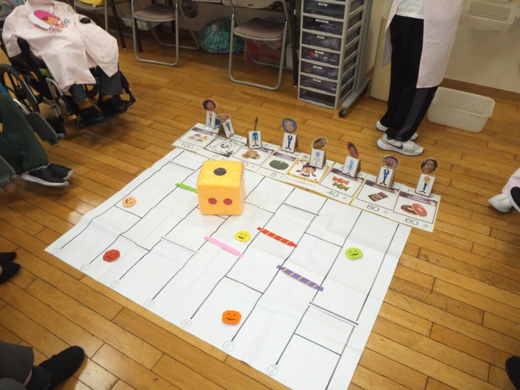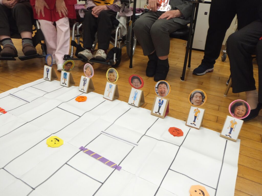 次の演目はレクリエーションの時間です。ゲームの説明をさせて頂きます。『🍬お菓子の箱』と『👻おばけの箱』の2種類があります。利用者の皆さまには まず『お菓子の箱』の中からくじを引いて頂きます。その中には『お菓子カード』と『おばけカード』が入っています。『お菓子カード』を引いたら、そこに書かれている点数を得ることができます。『おばけカード』を引いたら、みんなで『いたずら』合戦の 始まりです。利用者さま全員に『👻おばけの箱』から1つずつカップを引いて頂きます。カップに中には色々な『いたずら』が書かれています。一番ひどい『いたずら』の書かれている くじを引いた方(かた)が勝ちとなり、その方(かた)にサイコロを振って頂き、出目数に10倍を掛けた点数を得ることが できます。これを繰り返していき、最終的に1番得点の高い人が優勝というゲームに なっております。