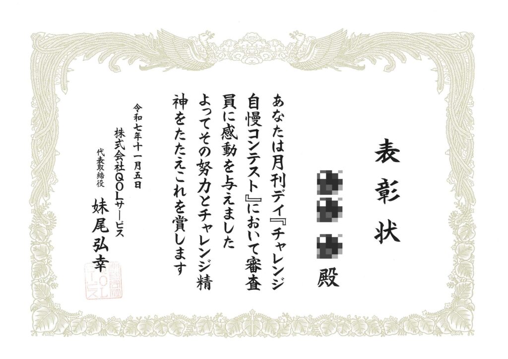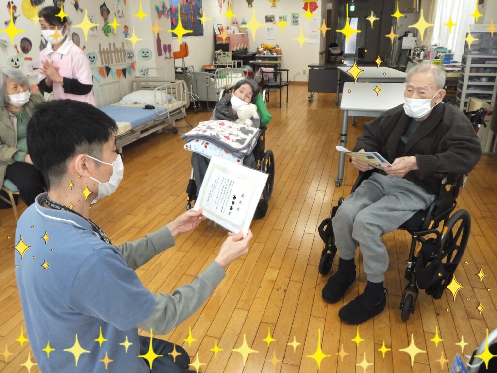 本日11月6日に、デイケア『よつば』で他利用者さまと共に お祝いをさせて頂きました。今回の流れを皆さまに お伝えしたところ他利用者さまからも『おぉ~!すごい!』等の歓声が上がりました。株式会社QOLから賞状が届いていましたので、スタッフが代行して贈呈させて頂きました。