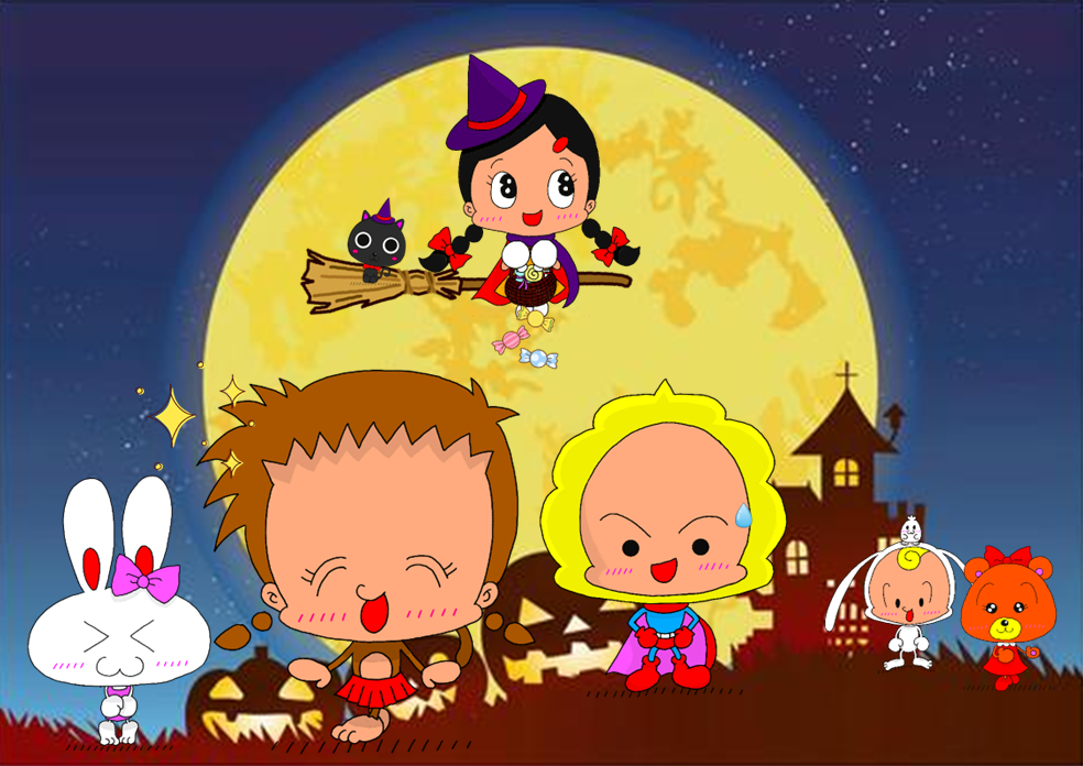 ②あるところに『クローバータウン』という街がありました。そこの街並みも すっかり秋模様に変わり、今ハロウィンパーティーの真っ最中です。よつばこちゃんを はじめ、ふたばこちゃんや きょたくくん、みつばこちゃんもハロウィンを楽しんでいました。そして よつばこちゃんは みんなに言いました。「今から お墓に行って きもだめし しようよ!」と。