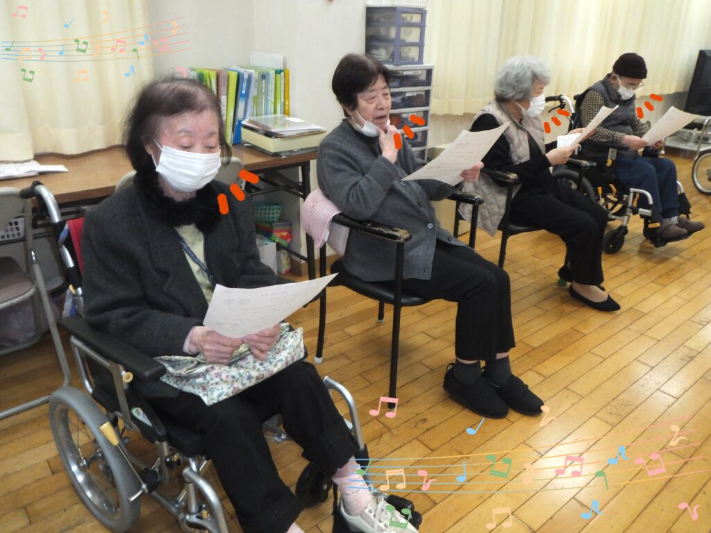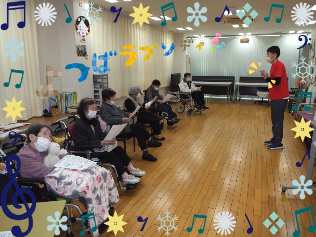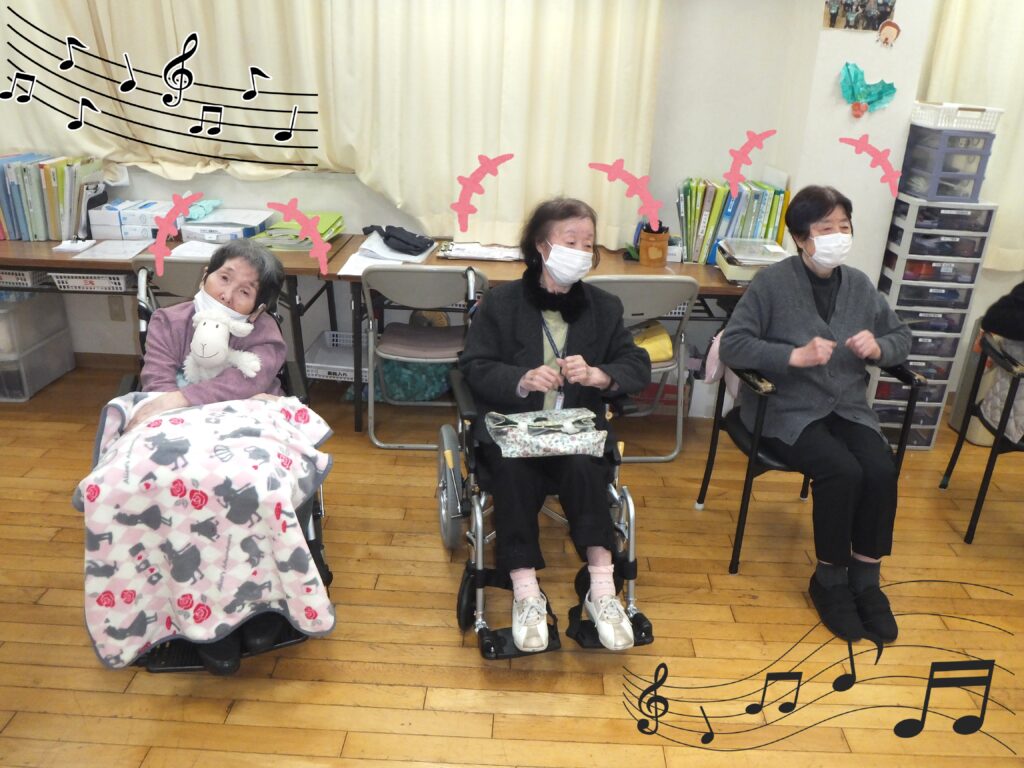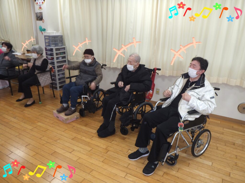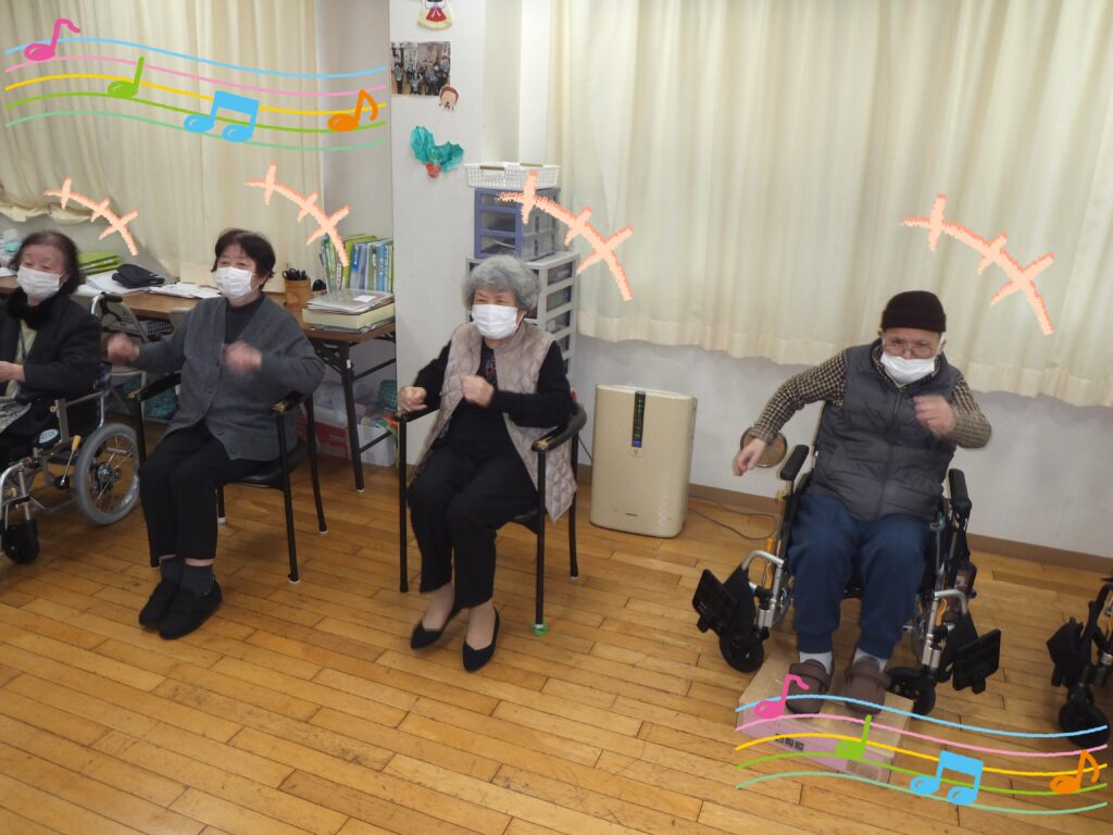 元気よく歌った後は、進行スタッフが考えた振付を、音楽に合わせ体操していきます。皆さま進行スタッフの動きを頑張って模倣して下さっていました🎵