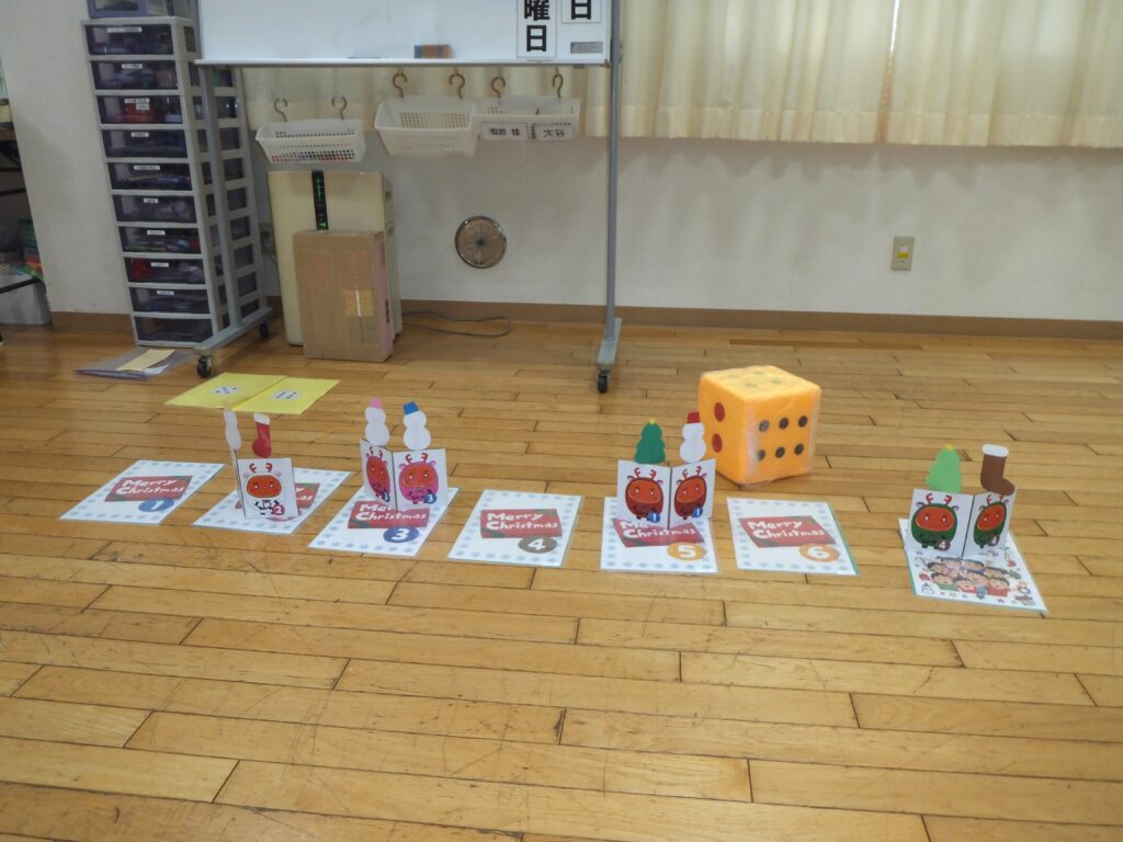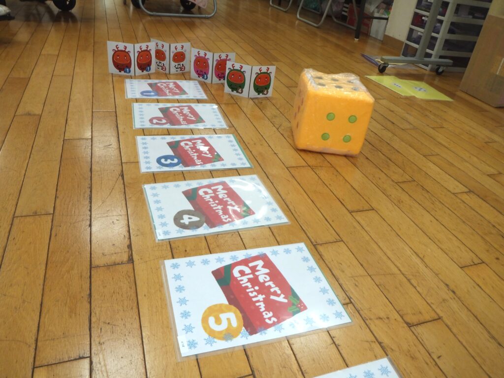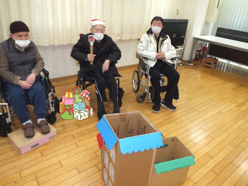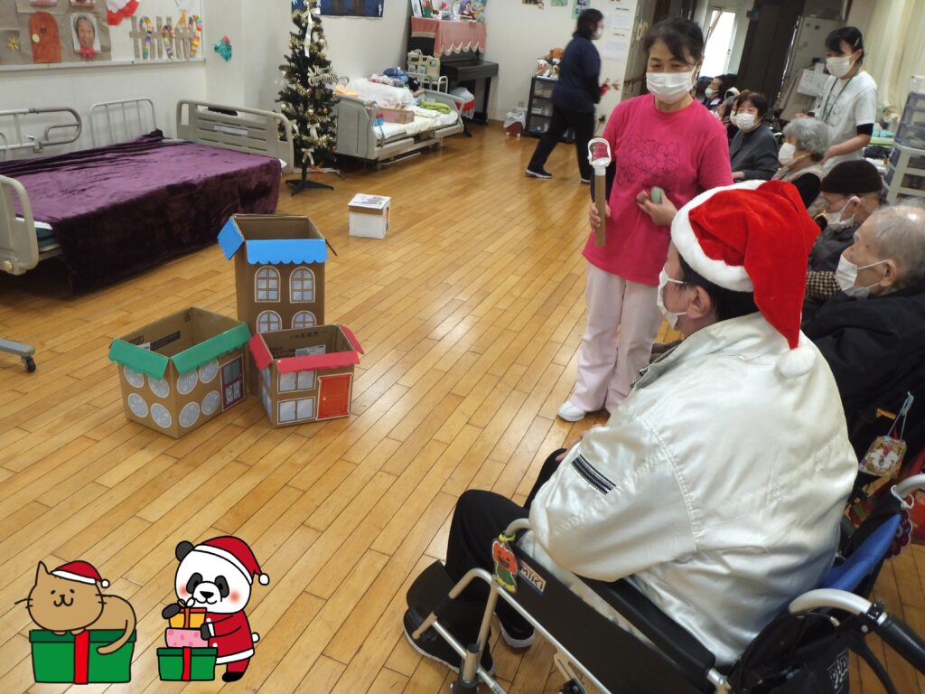 お次はゲーム(レクリエーション)の時間です。ゲーム名は『プレゼントを もらってうれしい!!』。利用者の皆さまにはサンタクロースになって頂きます。そして皆さまは子どもの待つ家にプレゼントを配ります。いかに子どもを たくさん笑顔にすることができるか というゲームです。