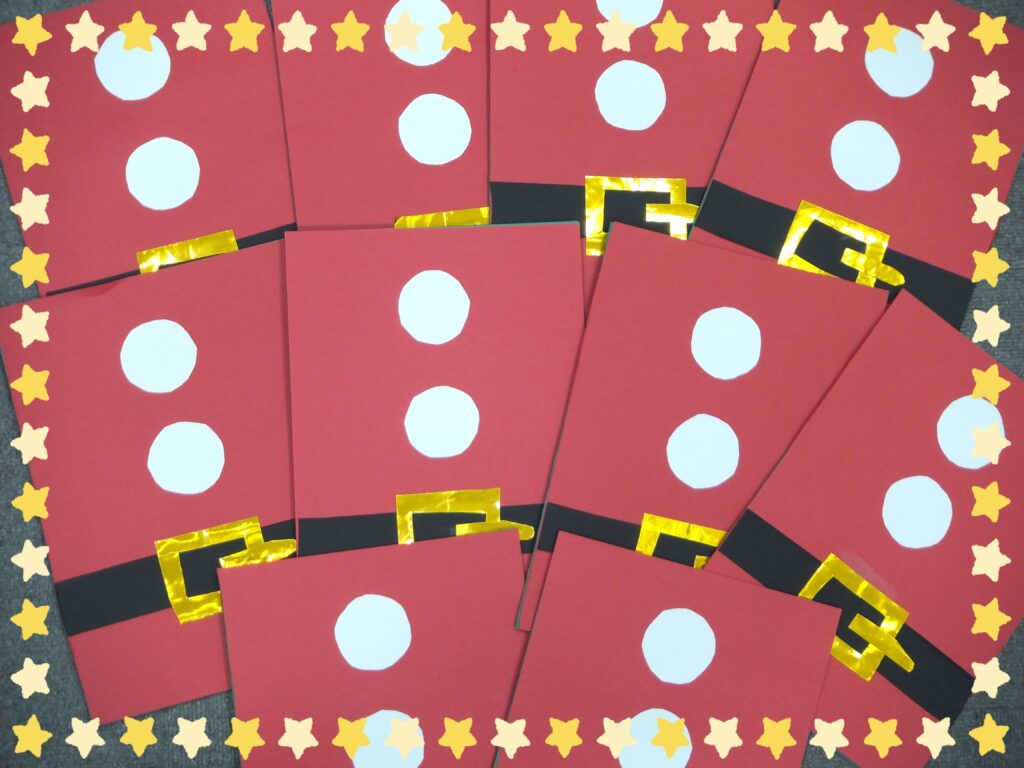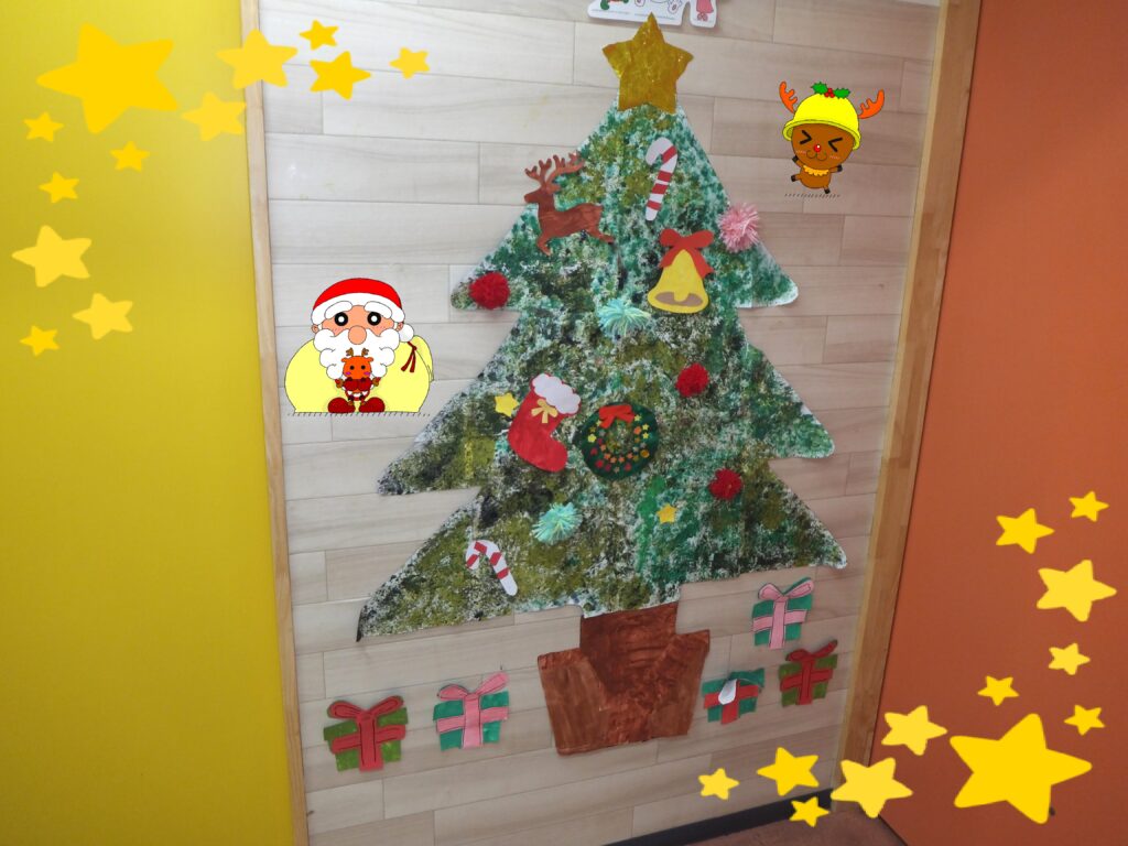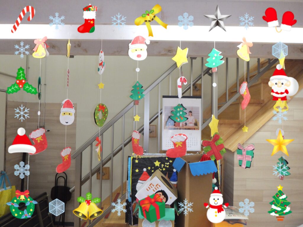 こちらは利用者の皆さまが作って下さった飾りです。『クリスマスの吊るし飾り』に『サンタとクリスマスツリーの貼り絵』です。とても可愛らしく できています。ちなみに『クリスマスツリー』の貼り絵は、それをバックに利用者の皆さまにはサンタの衣装を着て頂き写真を撮らせて頂きました📸