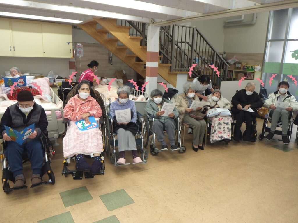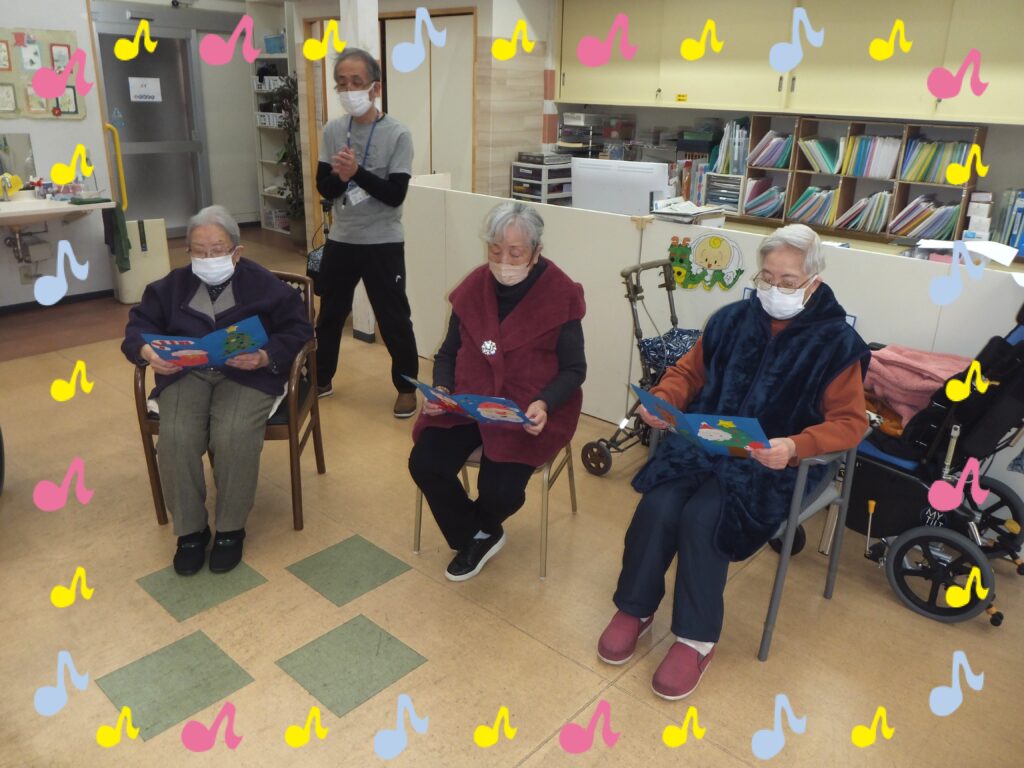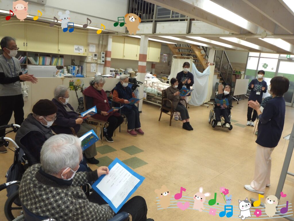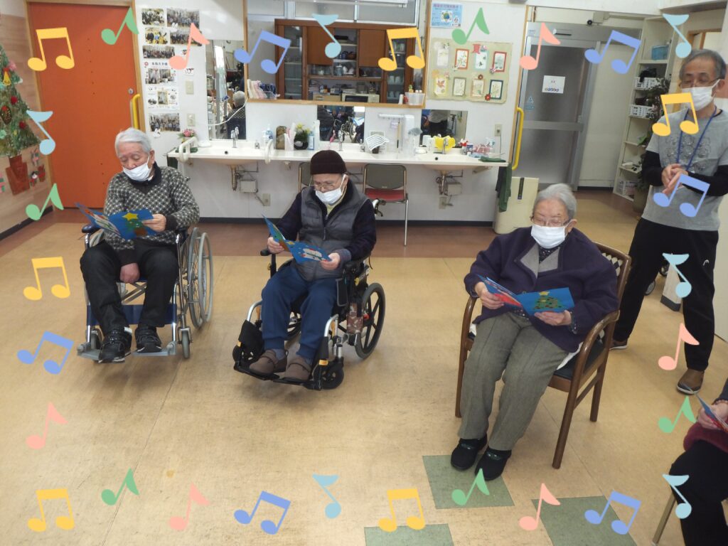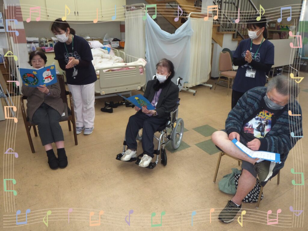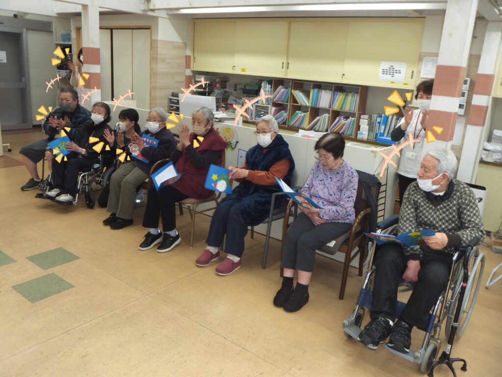 利用者の皆さまが手に持っている歌詞カード、皆さま個々で作られております。皆それぞれ個性があり、素敵に仕上がっています(=^・^=)