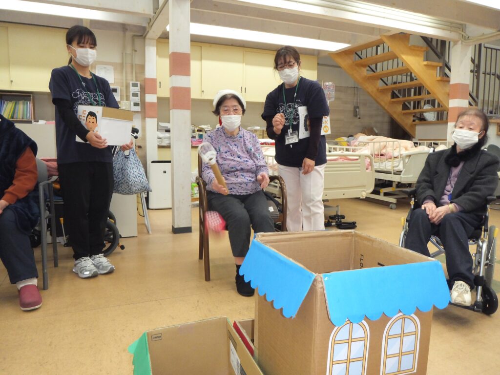 皆さま、投げ棒を使い 段ボールで作った家目掛けておじゃみを投げておられました。この投げ棒のコツは手首のスナップなのですが、スナップを上手に使える人は逆に飛びすぎる(段ボールの家を飛び越える)という難点もあります笑 ( *´艸`) 以外と調整が難しいかも・・・。