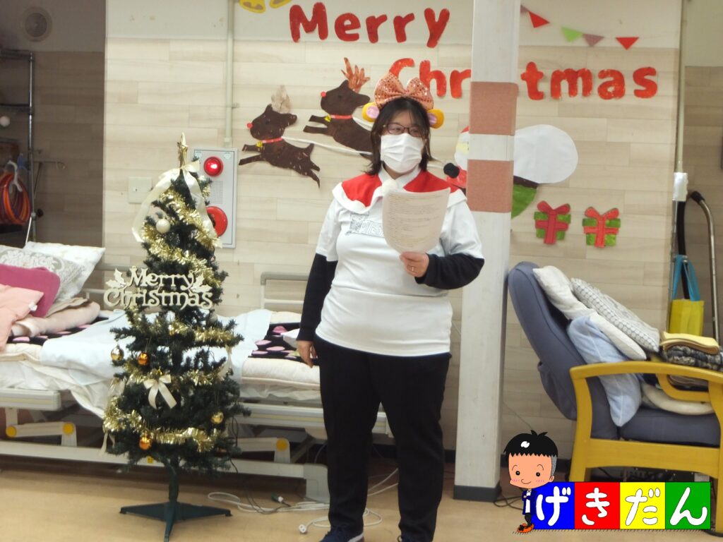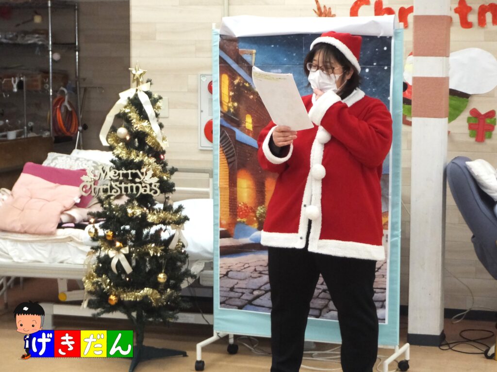 『クリスマス会』のオープニングです。司会進行から利用者の皆さまに『クリスマス』の説明だったり、飾り付けの紹介をさせて頂きました。