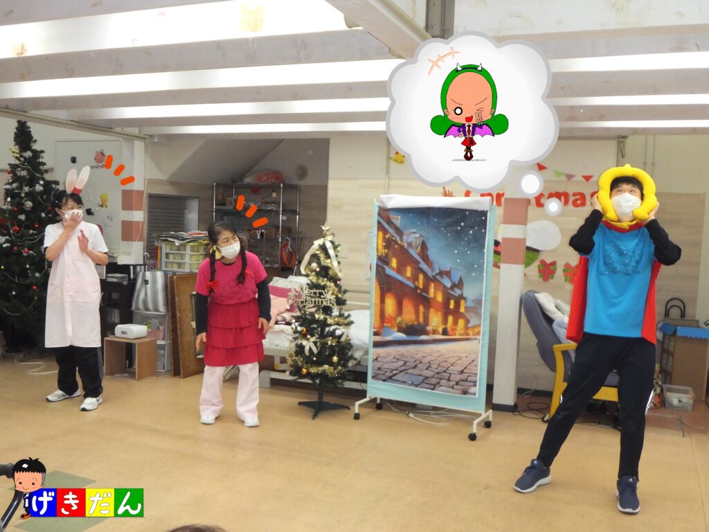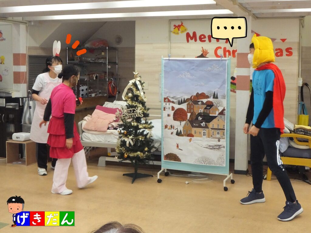 デイケア『ふたば』の『クリスマス会』も最後のプログラムとなりました。最後は すっかりお馴染みの『スタッフ劇団』の登場です。今回の物語のタイトルは『🍀よつばのクローバー🍀~クリスマス編~』です。