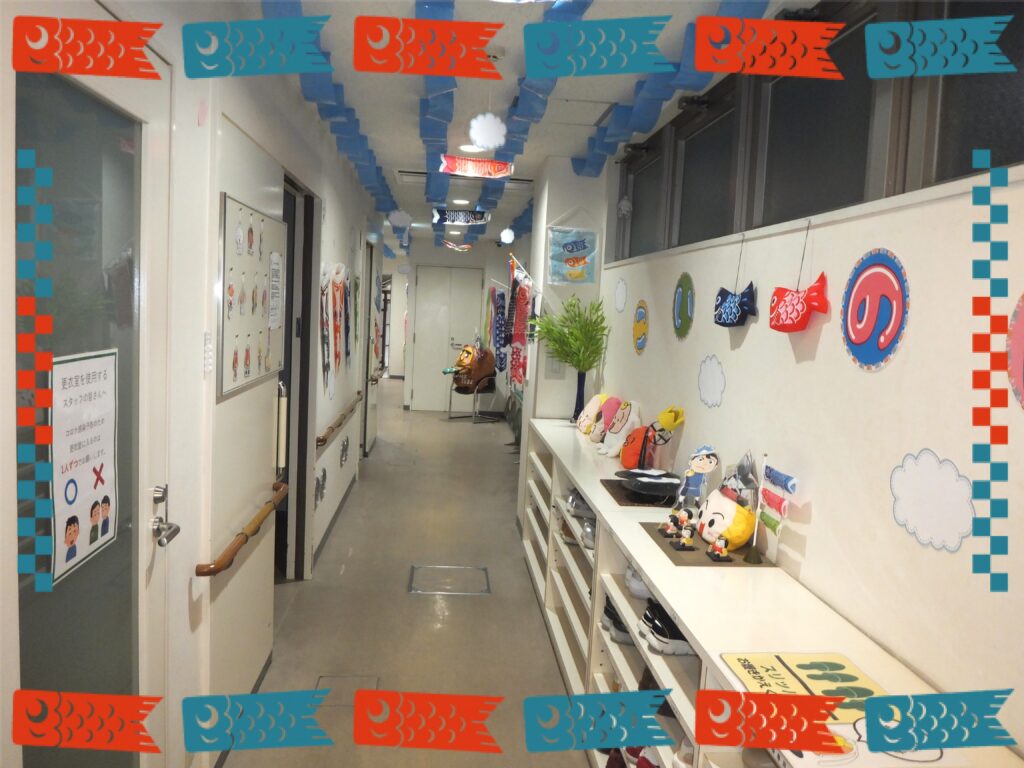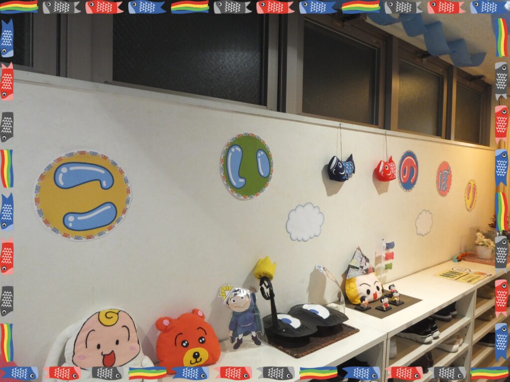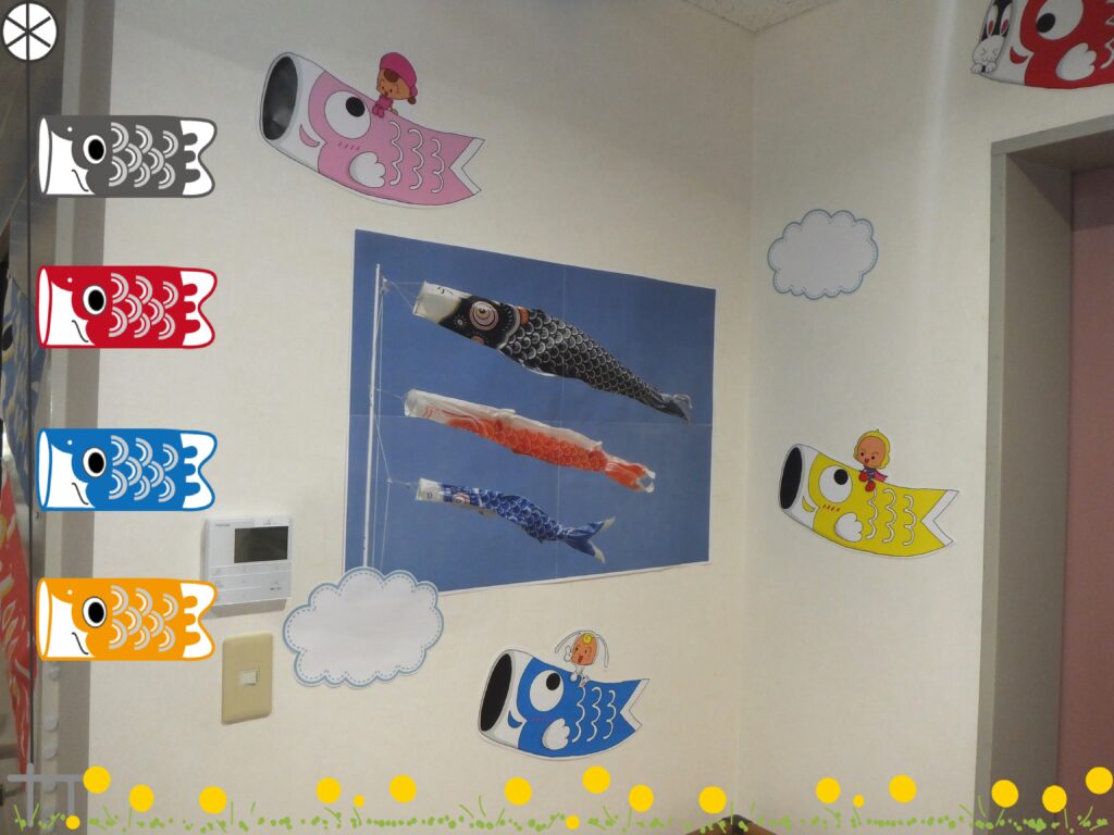 こちらは靴箱の上です。『こいのぼりロード』らしく【こ・い・の・ぼ・り】の文字を壁に貼ってみました。