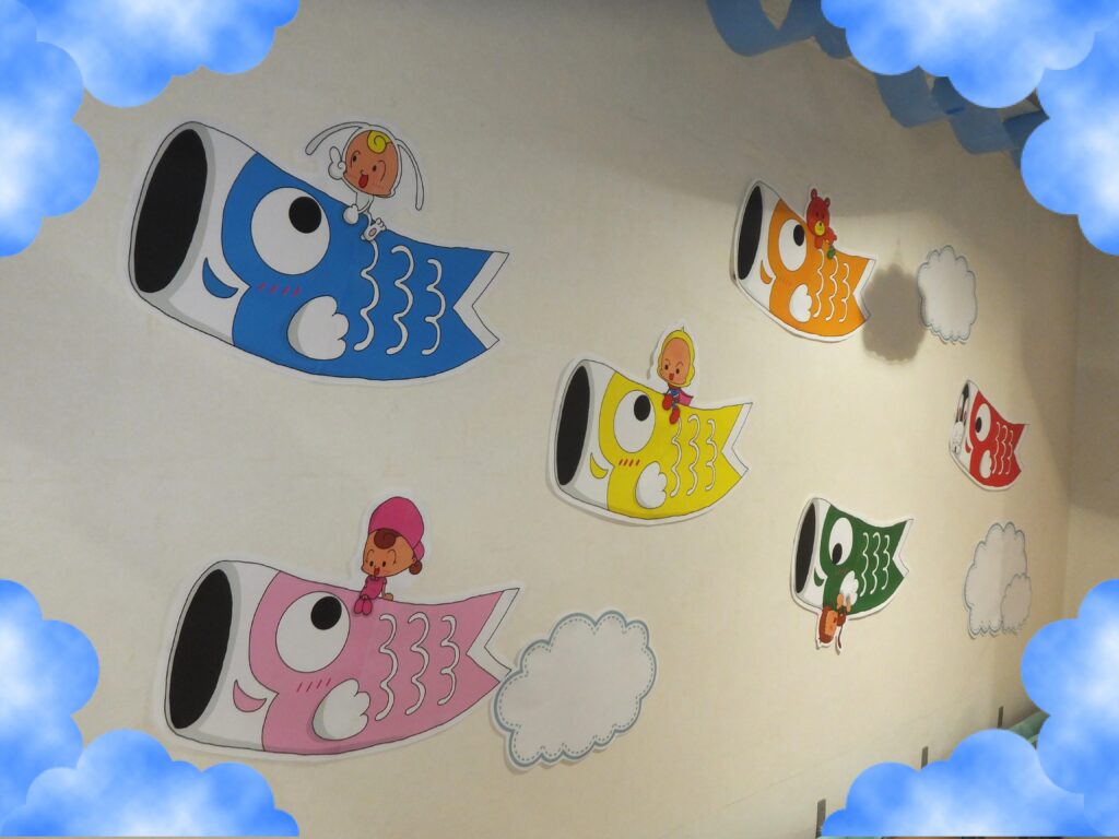 こちらは壁に『こいのぼり』と『雲』のイラストを貼り付けてみました。『雲』のイラストが あるだけで何だか少し空を泳いでいるように見えませんか?