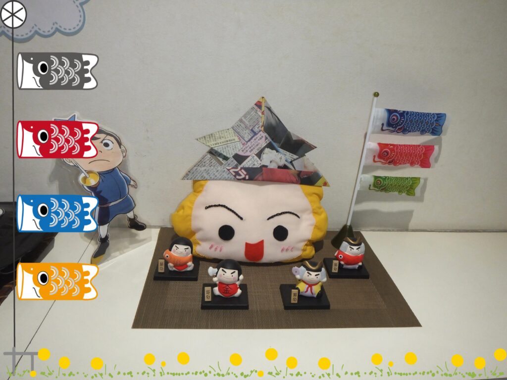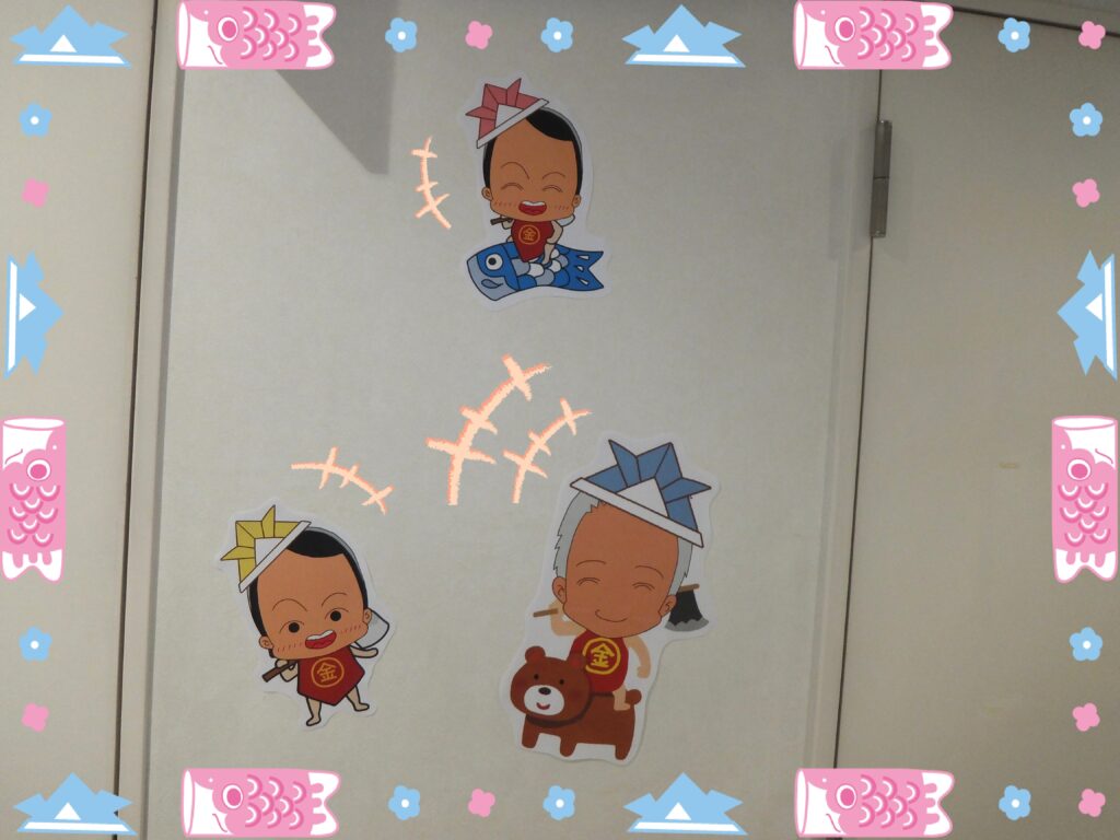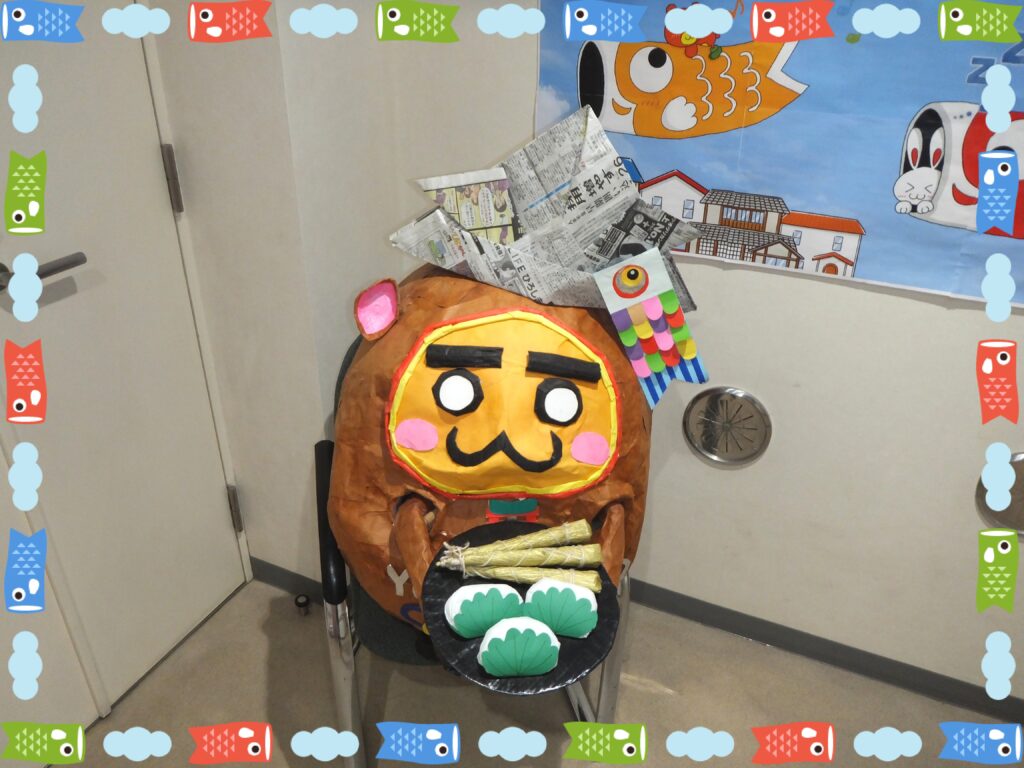 こちらは当キャラクターの『うんちまん』です。新聞紙で作った兜が良く似合っています。それを取り囲んでいる『金太郎くん』達も かわいいですね(≧▽≦)
