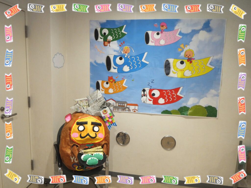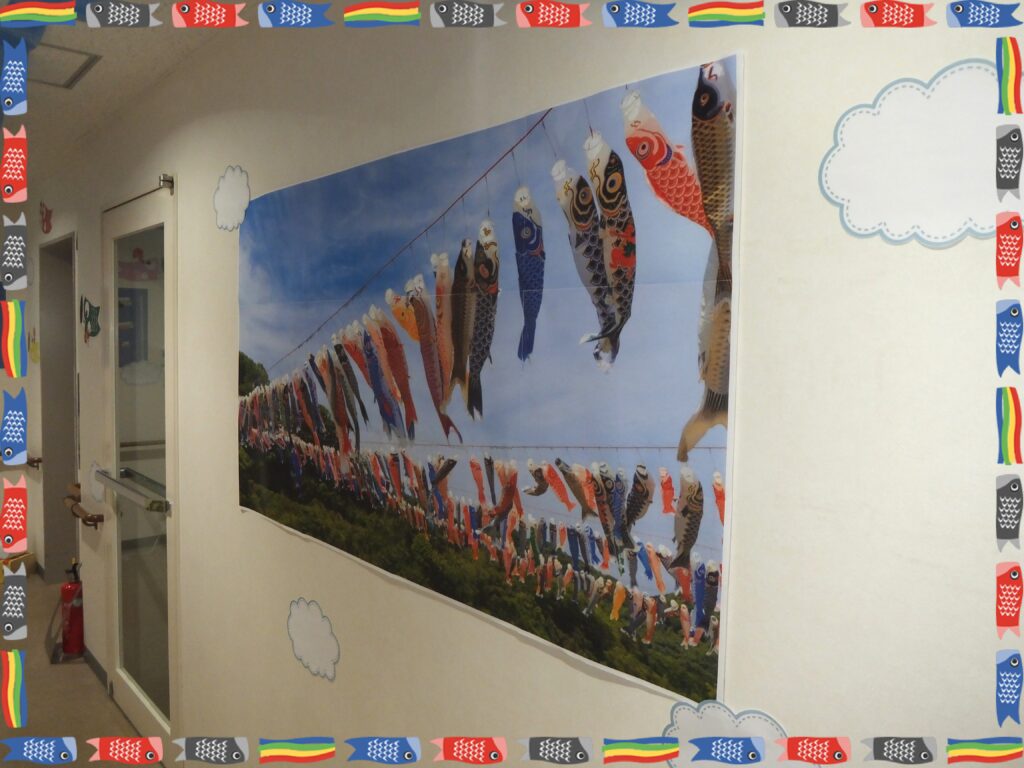 こちらはエレベーター前です。エレベーターを待つ利用者さまが退屈しないように、この『こいのぼり』の壁写真を見て楽しんで頂いています。