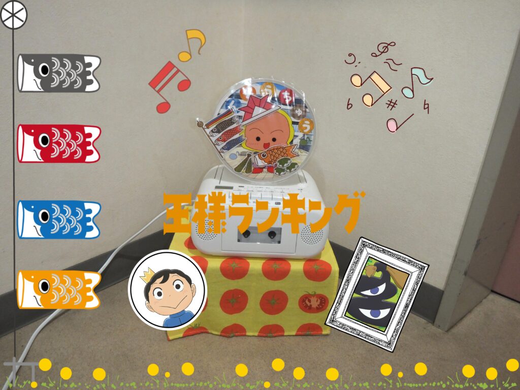 こちらは演奏担当の『うんちまん』です。今回は『アニメ【王様ランキング】』で使用された楽曲を流しております🎵『王様ランキング』の楽曲は良い曲が多いんです。そして上手く言えませんが、『冒険』『勇気』『喜び』等がテーマになっている楽曲もあり、それが『端午の節句』にも合うと思い流させて頂いております(*^▽^*)