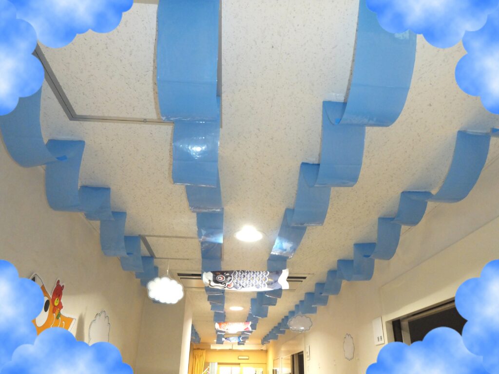 こちらは天井です。天井にも『こいのぼり』と『雲』を吊るしています。